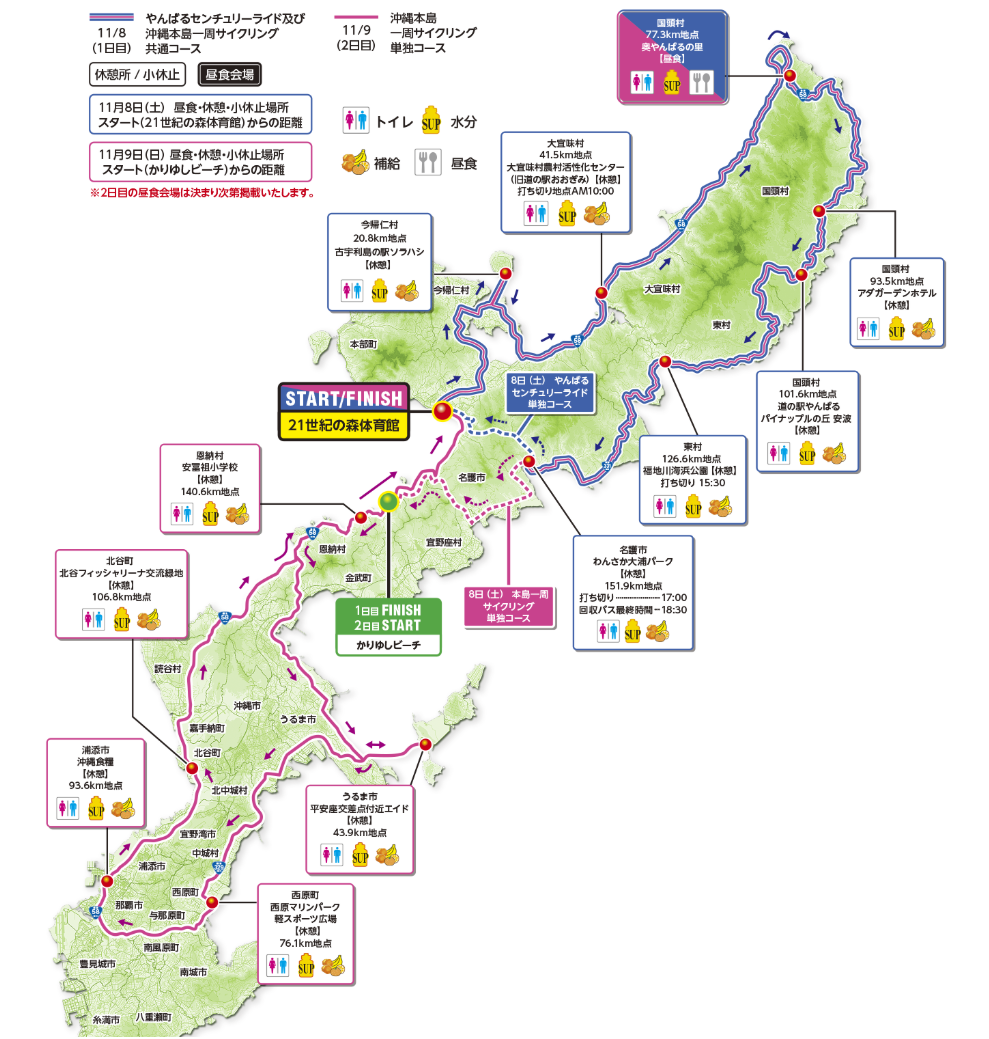 第一天,騎行路線會經過自然景觀豐富的「やんばる」(沖繩縣北部地區),這裡有起伏的地形,挑戰性十足;第二天則主要行駛於沖繩中南部,沿途可欣賞到沖繩的城市風光、度假區以及海岸線等多樣化的景色。