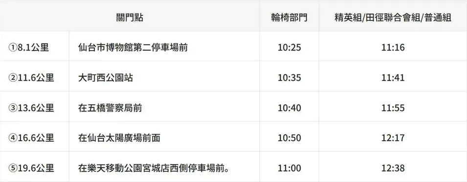 - 大門關閉後無法繼續比賽。關門時間後留在賽道上的跑者應立即脫下運動員號碼布,走上人行道,按照官員的指示登上運動員巴士。